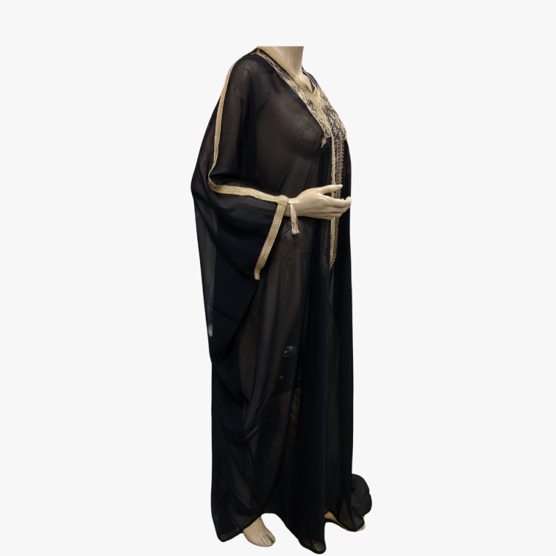 Elegant Tunisian black thobe made from a comfortable cotton-blend fabric, featuring 3-quarter sleeves. Lightweight and breathable, ideal for casual wear or cultural occasions.
