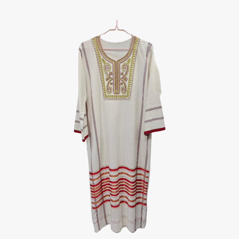 Elegant white robe featuring intricate embroidery at the neckline and striking red-orange horizontal stripes near the hem. Handcrafted with attention to detail, it blends traditional artistry with bold, contemporary accents—perfect for cultural events or stylish everyday wear.