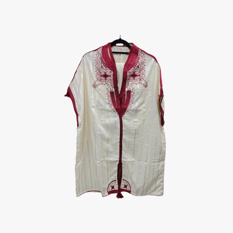 Luxurious white-cream satin-finish robe adorned with deep maroon embroidery, featuring a central tassel and geometric patterns. Elegant and handcrafted, it’s perfect for special occasions or sophisticated everyday wear.