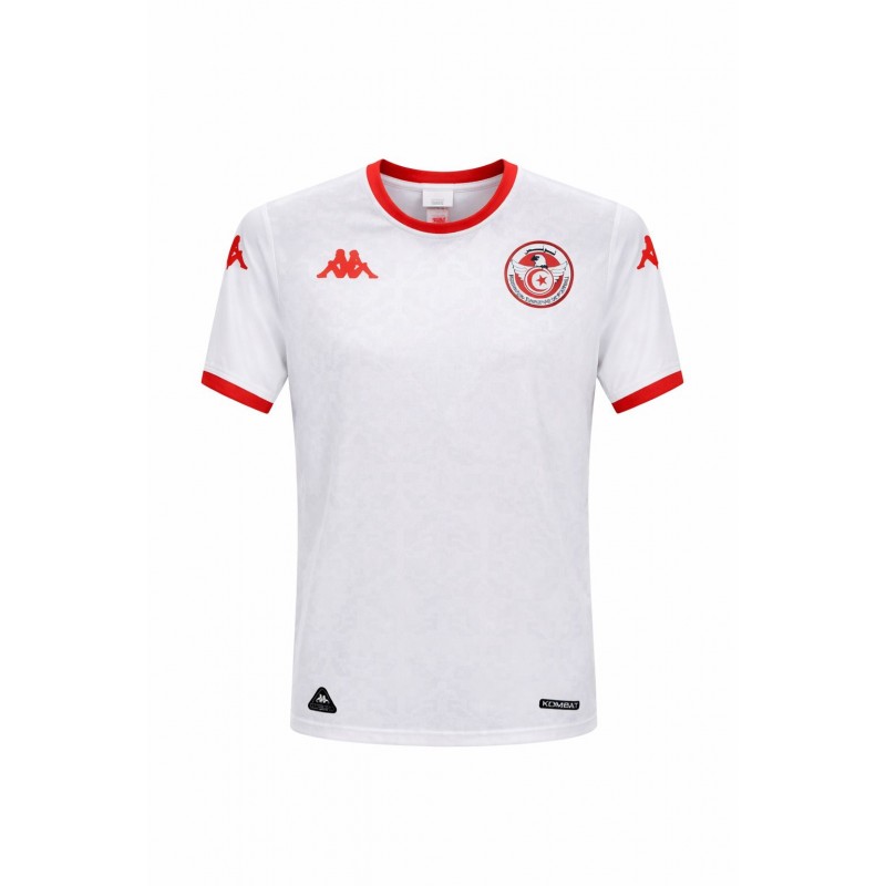 Represent Tunisia with elegance in this official away football jersey. Designed in a crisp white color with striking red details, it features the national team crest proudly on the chest. Made from lightweight, breathable fabric, it ensures maximum comfort whether you're on the pitch or supporting from the stands. The athletic fit and subtle textured pattern add a contemporary touch, while durable stitching guarantees long-lasting wear. A perfect blend of style, comfort, and national pride.
