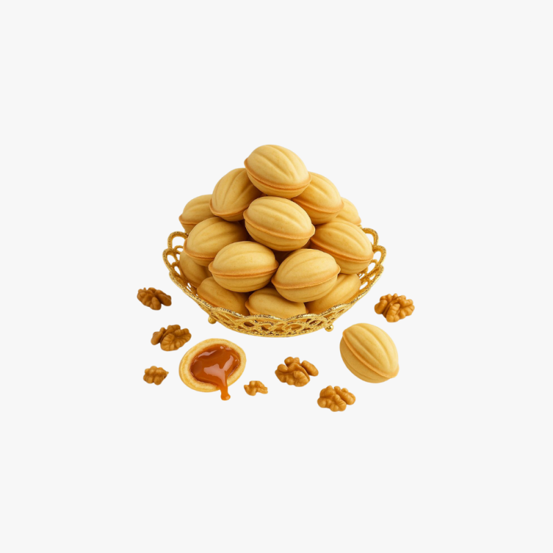 A delightful surprise in every bite, our Walnut Cookies are a true treat for the senses. These charming cookies are baked in a special mold to perfectly resemble a walnut shell. Inside, they hold a generous filling of rich, creamy caramel (dulce de leche). They are a wonderfully decadent sweet that's perfect for celebrations and sharing with loved ones.